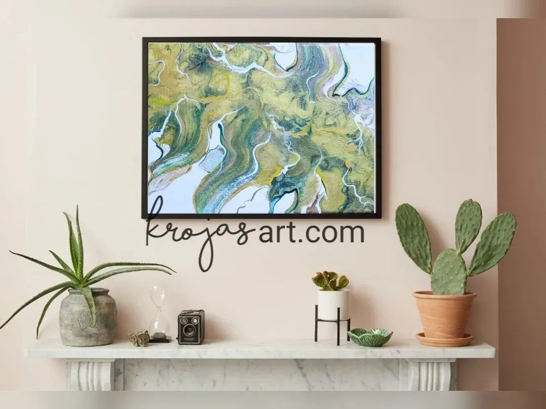 This is an acrylic pour on a 9 x 12 perfect for an office space. It comes unframed on on a raised canvas. Gold, dark blue, green, and white Earth tones dominate this piece.