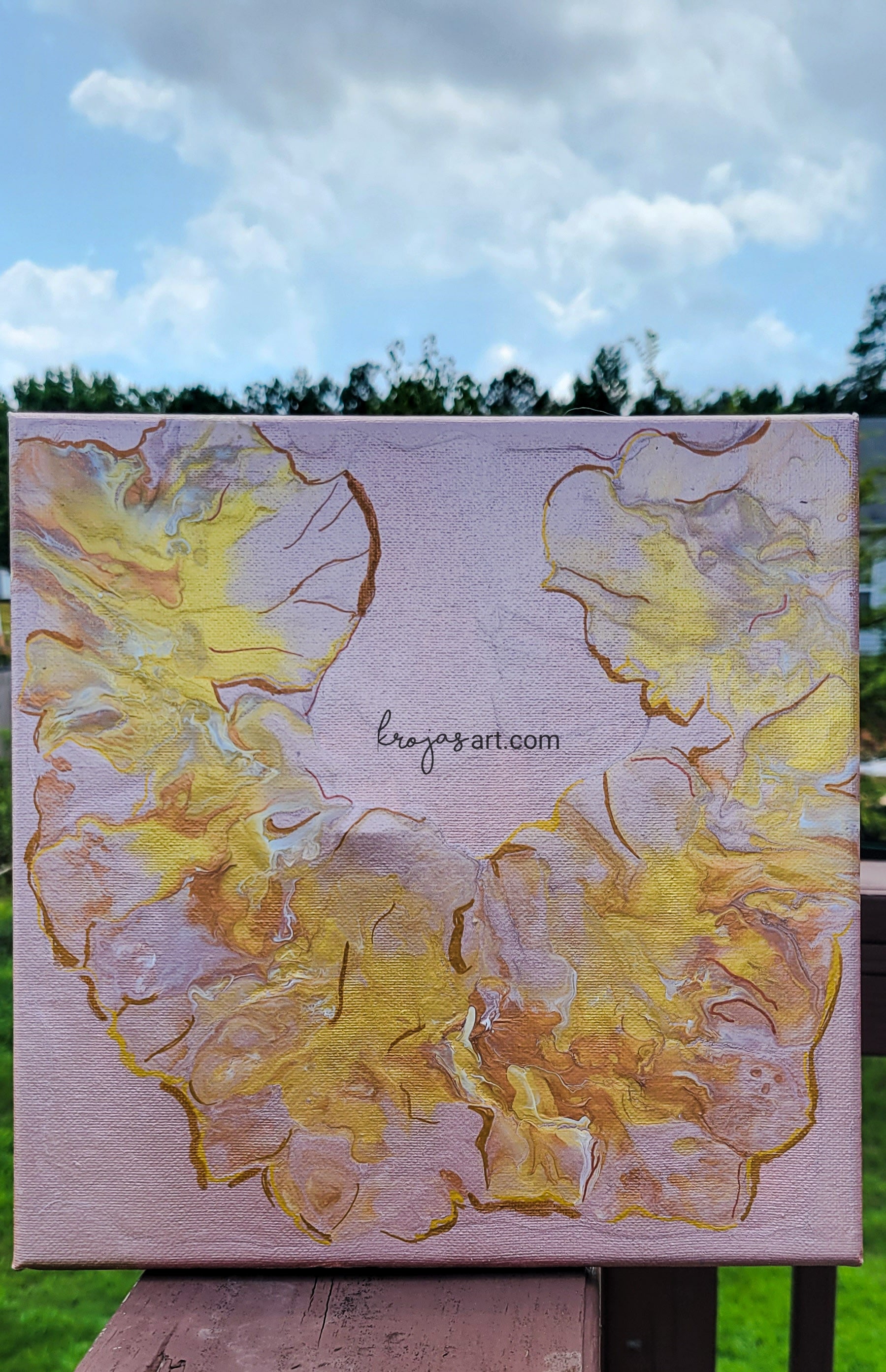 10 x 10 Abstract Piece that features rose gold and golden tones with hints of titanium white. A perfect little accent piece.