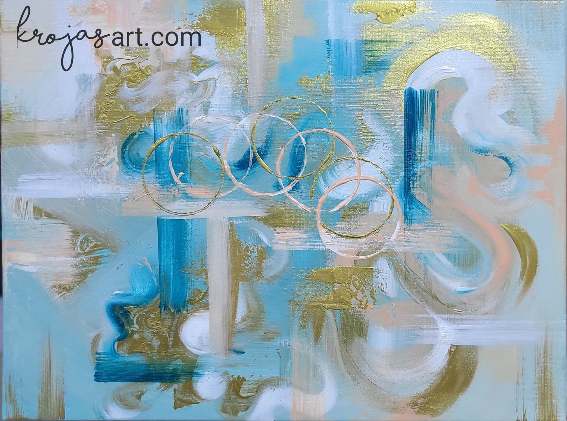 This is on an 18 x 24 raised canvas. Acrylic paint as the medium. Various blues, coral, and golds are combined on this piece.