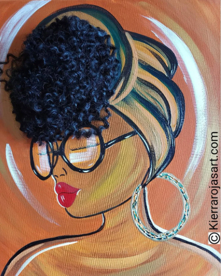 This is a customized piece that is made to order. Tan, brown, mars orange, and gold are the featured colors. Head wraps can be any color of your choice. Woman can be wearing glasses if desired. Made with synthetic hair. This customized piece is on a 16 x 20 raised canvas.